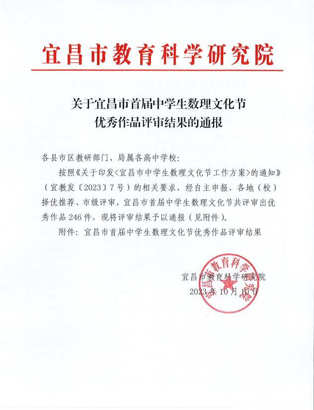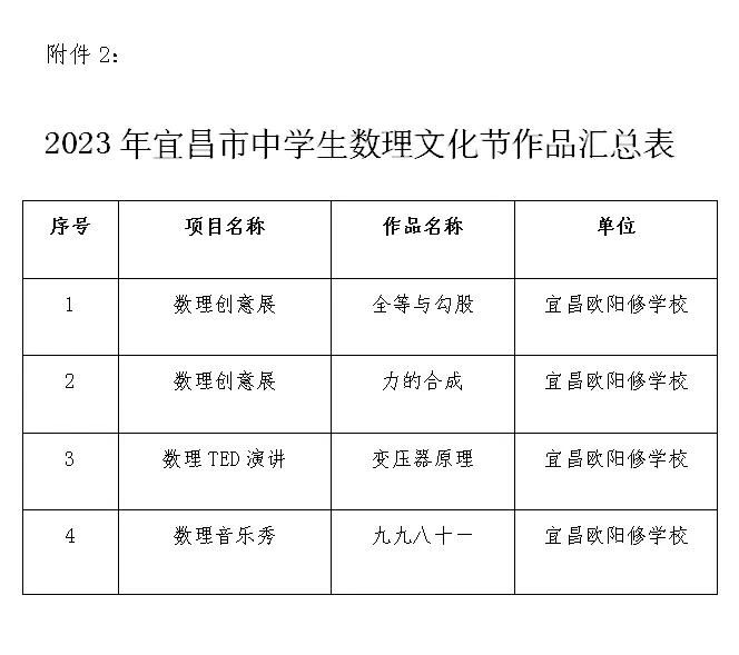 在宜昌市首屆數(shù)理文化節(jié)優(yōu)秀作品展評(píng)活動(dòng)中,宜昌歐陽修學(xué)校學(xué)子載譽(yù)歸來。我校共報(bào)送優(yōu)秀作品4件,其中2件獲得市級(jí)獎(jiǎng)項(xiàng),分別是二等獎(jiǎng)和三等獎(jiǎng)。
