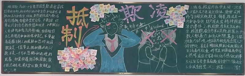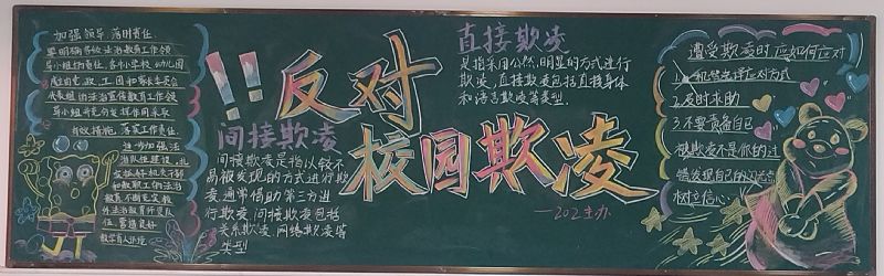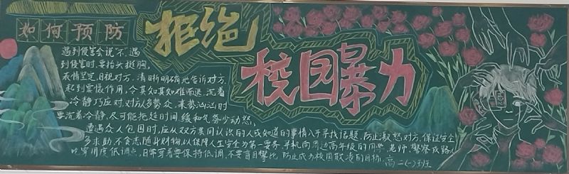 為預(yù)防校園暴力事件,構(gòu)建平安和諧校園,增強(qiáng)學(xué)生法治知識(shí),提高學(xué)生安全防范意識(shí)和自我保護(hù)能力。10月份我校開展了以“預(yù)防校園暴力、杜絕欺凌事件”為主題的板報(bào)活動(dòng),引領(lǐng)全體學(xué)生自覺遵守法律法規(guī)、校規(guī)校紀(jì),理性對(duì)待同學(xué)之間的矛盾糾紛,克制不良行為。10月底,學(xué)生會(huì)秘書部在校團(tuán)委羅書記的帶領(lǐng)下對(duì)本次黑板報(bào)進(jìn)行了檢查和評(píng)比,201班、202班、204班黑板報(bào)榮獲優(yōu)秀等級(jí)。