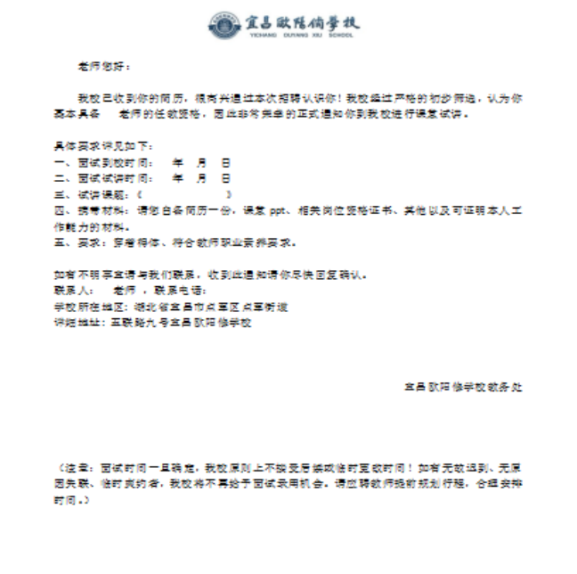 二、應(yīng)聘教師將收到以下書面通知材料: